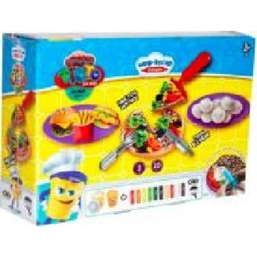 | Комплектация | инструкция, комплект из 3-х стеков, лопатка для пиццы, набор игрушечных столовых приборов, скалка, тесто для лепки - 10 шт., тесто для лепки в баночках - 2 шт., формочка для изготовления пиццы, шпажки для шашлыка - 2 шт., экструдер |